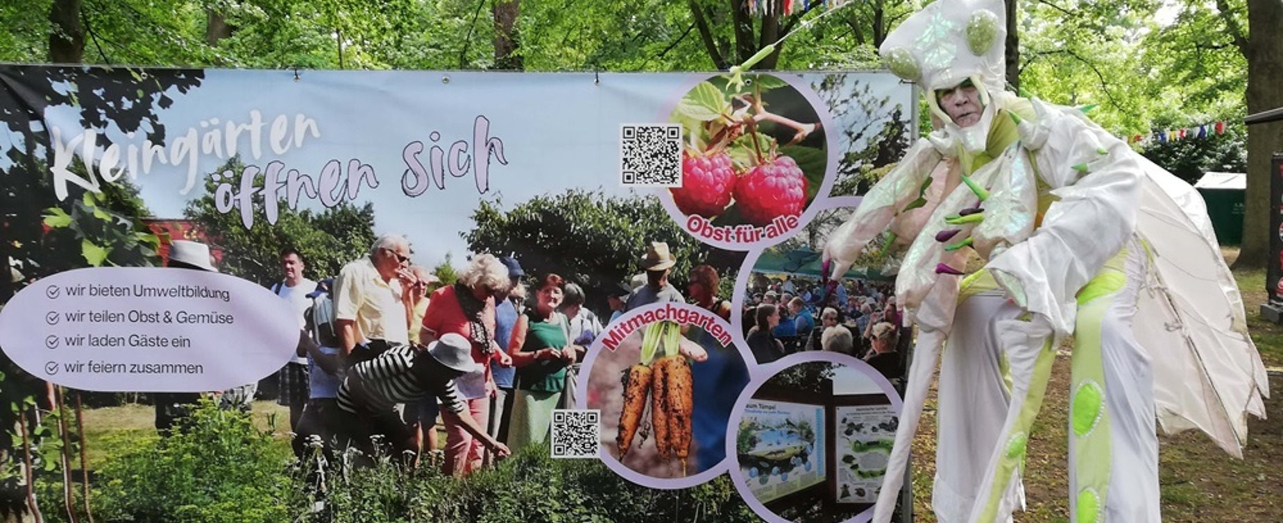 Eine Ausstellung mit 12 großen Bannern vertrat im Stadtpark Lichtenberg symbolisch Berlins Kleingartenanlagen und die Leistungen der Vereine. Rechts im Bild die "Gottesanbeterin" auf Stelzen zum "Größenvergleich".