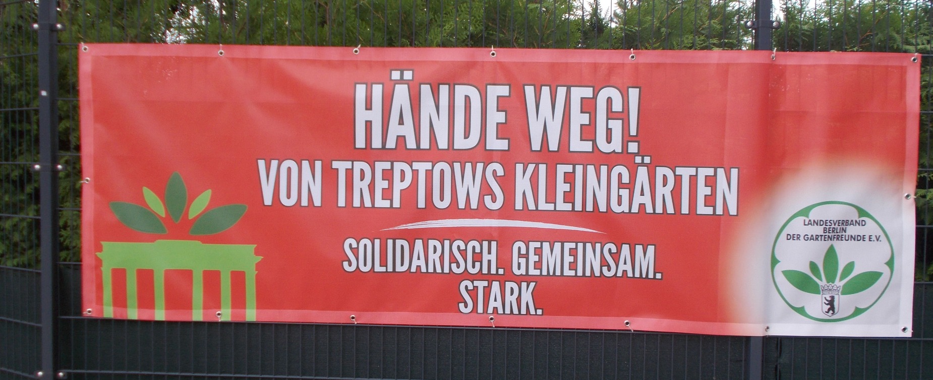 Der Landesverband dankt im Namen der betroffenen Gartenfreunde in Treptow-Späthsfelde allen Banner-Akteuren für die öffentlich gezeigte Solidarität ihres Vereins: Tausend Dank in die Bezirke! Leserinnen und Leser seien sich gewiss: es hängen mehr rote Banner in Berlin, als wir hier zeigen können.