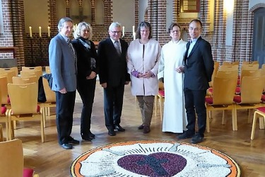 Dr. Dieter Bonitz, Viola Kleinau, Gert Schoppa, Bettina Wottke, Sigrun Neuwerth und Dr. Matthias Lang präsentieren die Lutherrose in der Lutherkirche Wilhelmsruh. Foto: Guido Kleinau